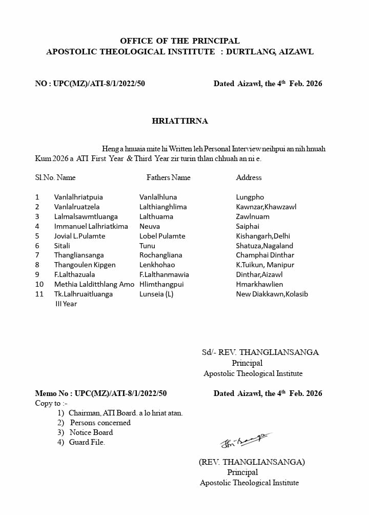 ATI Board chuan Kum 2026 Session atana zirlai lakna Written leh Interview chu february ni 4 Nilaini khan ATI Campus Durtlangah an nei a, First Year atan zir lai 10 an la thar.