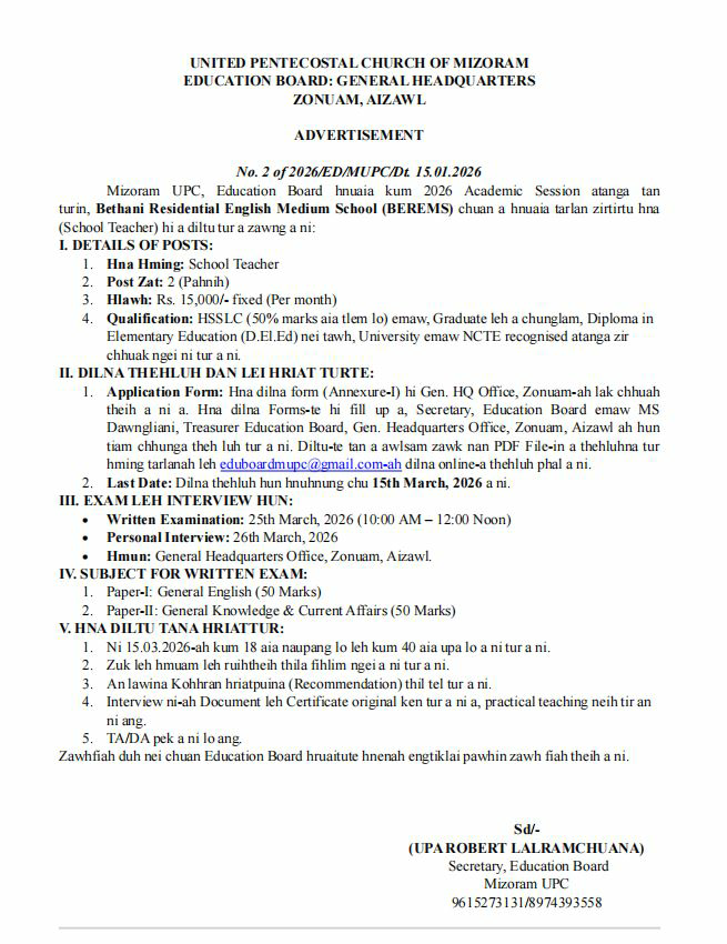 General SS Dept. hnuaia Zirlaibu thar buatsaihtu atana Committee din, Consultation Committee chuan thu chhuah siamin, Kum 2028 atang hian NPSS Zirlaibu thar tur buatsaih a ni dawn a, rawtna neite tan kumin March ni 31 thleng hun an hawng a, Upa H. Lalremruata, Secretary Consultation Committee hnenah PDF-in rawtna kan neihte chu Whatsapp number 9366747266-ah hian theh luh tur a ni.