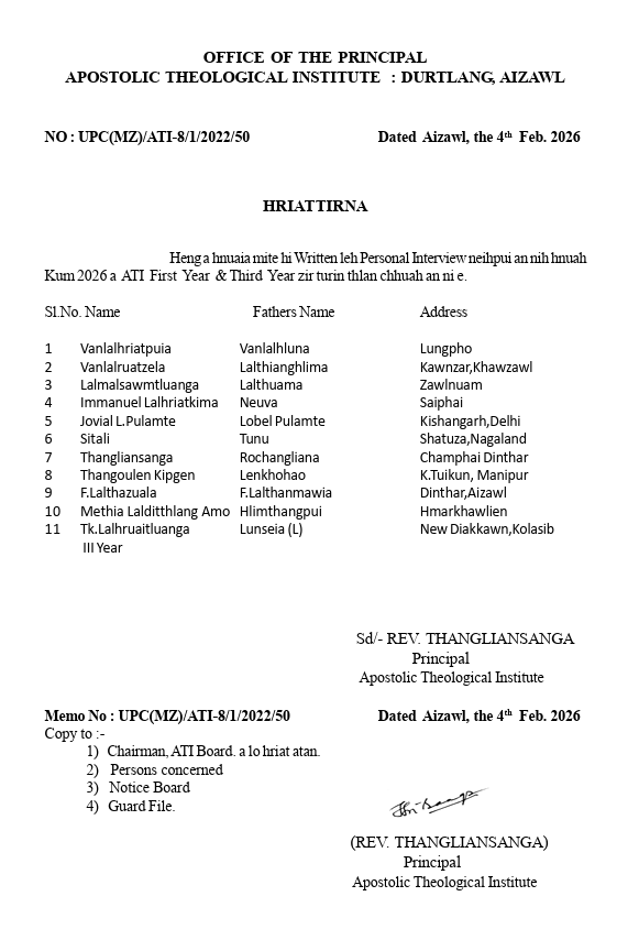 Mizoram UPC Bible zirna, Apostolic Theological Institute (ATI), Durtlang chuan February ni 9 (Thawhṭanni) chawhnu dar 1:00 khan registration day an hmang.