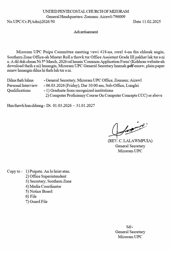 Mizoram UPC General Headquarters chuan Sub Office Lunglei a Muster Roll-a thawk tur Office Assistant Grade III(Jr) pakhat a la thar dawn a, Graduate tan dilna hun March ni 5 thleng hawn a ni.
